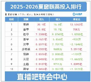 夏窗關閉倒計時2天14小時,英超已投入超30億=意甲+德甲+西甲+法甲的投入總額。