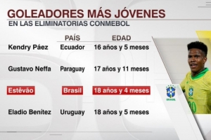 體育資訊9月5日訊 北京時間今天上午進行的南美世預賽,埃斯特旺倒鉤破門,目前巴西主場3-0領先智利。據ESPN統(tǒng)計,現年18歲4個月的埃斯特旺是南美世預賽歷史第三年輕進球者。