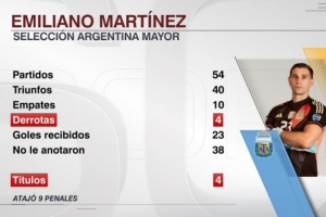 據ESPN統計,大馬丁為阿根廷國家隊出戰54場比賽,僅輸掉其中4場。