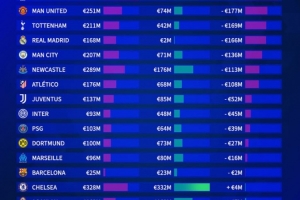24直播網09月05日訊 德轉統計今夏20支歐洲球隊轉會收支。阿森納、利物浦和曼聯為凈支出前三,分別高達2.84億、2.63億和1.77億歐元。切爾西、AC米蘭等7支球隊實現盈利,其中法蘭克福以6900萬歐元凈收入位居榜首。