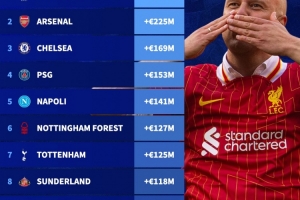 24直播網09月05日訊 2025年夏窗后,德國轉會市場公布了球隊身價漲幅榜。利物浦以2.54億歐的漲幅高居榜首,阿森納(2.25億歐)和切爾西(1.69億歐)分列二、三位。榜單顯示,豪門球隊因引援和球員升值,整體身價大幅提升,英超球隊表現尤為突出。