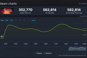 體育資訊9月6日訊?萬眾矚目的類銀河戰士惡魔城游戲《空洞騎士:絲之歌》已于9月4日正式發售,根據SteamDB數據顯示,截止今日10點,《絲之歌》在Steam平臺的在線人數峰值再創新高,現已超越56萬人!
