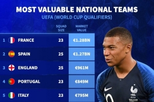 24直播網09月06日訊 根據《轉會市場》統計的世歐預歐洲國家隊身價榜,法國隊以12.8億歐元力壓西班牙(12.7億)排名榜首。英格蘭(9.61億)、葡萄牙(8.49億)和意大利(7.95億)分列三至五位,展現了歐洲足壇頂級陣容的身價實力。