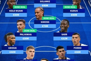 24直播網09月06日訊 熱刺新賽季兩套陣容總身價7.44億。主力陣4.57億,由新援哈維-西蒙斯領銜,前鋒索蘭克、庫杜斯及后衛范德文、羅梅羅構成核心。替補陣2.87億,含特爾、理查利森等實力球員。球隊陣容總身價高,深度充足。