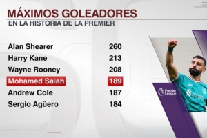薩拉赫以189粒英超進(jìn)球位列歷史第四,距離追平魯尼僅差19球。