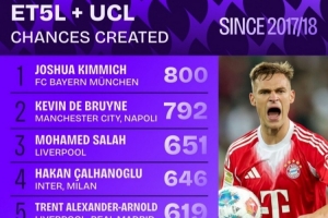 24直播網09月07日訊 根據數據機構squakwa統計,自17-18賽季以來,在五大聯賽與歐冠的創造機會榜上,拜仁慕尼黑的基米希以800次機會位居榜首,力壓曼城與那不勒斯的德布勞內(792次)。薩拉赫、恰爾汗奧盧和阿諾德分列三至五位,展現了中場大師在進攻組織中的核心作用。