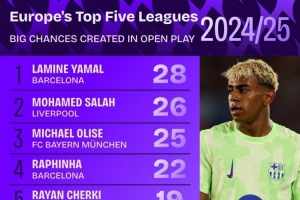 24直播網09月07日訊 根據Squawka統計,上賽季五大聯賽球員在運動戰創造重大機會次數排名出爐。17歲的亞馬爾以28次機會位列榜首,薩拉赫和奧利塞以26次和25次緊隨其后,拉菲尼亞、謝爾基等球員也躋身前十。