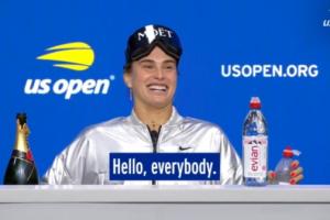 賽后薩巴倫卡拿著一瓶香檳和一瓶水到發布會現場,薩巴倫卡說道:大家好,這會是一場有趣的媒體發布會。