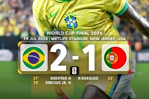 巴西2-1葡萄牙,羅德里戈先拔頭籌,C羅下半場扳平比分,維尼修斯制勝。