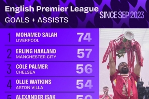 24直播網09月07日訊 切爾西球員帕爾默自2023年9月英超首秀以來,參與進球數達56球,僅次于薩拉赫(74球)與哈蘭德(57球),排名第三,表現搶眼。