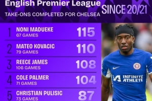24直播網09月07日訊 根據Squakwa統計,20-21賽季至今的切爾西英超過人榜上,現阿森納前鋒馬杜埃凱以115次成功過人居首。榜單中,僅里斯-詹姆斯、帕爾默和斯特林3位球員仍在陣中,其余如科瓦西奇、普利西奇、芒特等多名前球員已先后離隊。