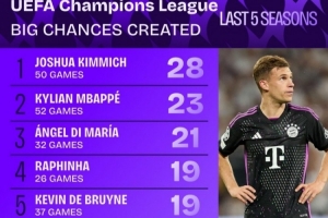 24直播網09月07日訊 根據Squakwa統計,近5個賽季歐冠創造重大機會榜中,拜仁中場基米希以50場28次領跑。姆巴佩、迪馬利亞分列二、三位。B費雖僅19場,但貢獻16次機會,效率位居前十最高。