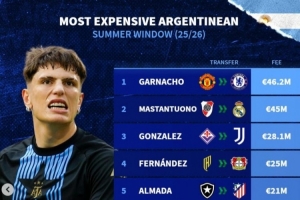 24直播網(wǎng)09月08日訊 《轉(zhuǎn)會市場》公布了今夏阿根廷球員轉(zhuǎn)會費榜單。曼聯(lián)前鋒加納喬以4620萬歐元加盟切爾西,高居榜首。河床新星馬斯坦托諾以4500萬歐元轉(zhuǎn)會皇家馬德里,位列第二。其余球員包括岡薩雷斯、埃茲奎爾-費爾南德斯等,轉(zhuǎn)會費均在千萬歐元級別。