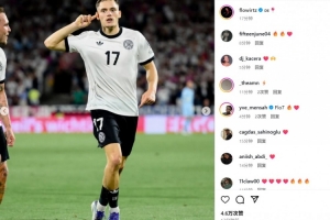 維爾茨也在賽后通過社媒曬出自己進(jìn)球后的單手捂耳朵慶祝照,并配文:“德國隊(duì)”。