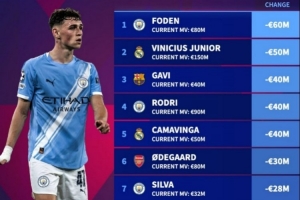 2025年球員身價跌幅榜:福登身價下跌6000萬歐居首,維尼修斯下跌5000萬歐次席