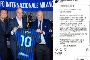 24直播網(wǎng)09月11日訊 國際足聯(lián)主席因凡蒂諾訪問國米總部,稱此行如“回家”。他與馬洛塔、薩內(nèi)蒂等高層會面,就球員福祉、國際賽程及足球未來等議題深入交流。參觀榮譽(yù)室后,他深受觸動(dòng),并在社交媒體分享身著藍(lán)黑軍團(tuán)的合影,表達(dá)了對此次訪問的榮幸與喜悅。