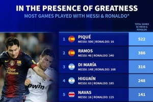 24直播網09月11日訊 《轉會市場》統計了與梅西、C羅都共事過的球員并肩作戰場次,皮克以522次居首,他代表巴薩與梅西合作506次,隨西班牙與C羅交手16次。拉莫斯(386次)和迪馬利亞(316次)分列二三位,其他球員如伊瓜因、納瓦斯等也榜上有名。