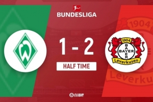 傷停補時7分鐘。上半場比賽結束,不萊梅1-2勒沃庫森。