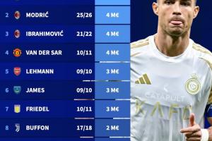 24直播網(wǎng)09月12日訊 轉(zhuǎn)會市場網(wǎng)盤點足壇40歲以上球員身價排名,C羅以1200萬歐元高居榜首。莫德里奇、伊布等名緊隨其后,布馮、馬爾蒂尼等傳奇亦在列,彰顯老將持久價值。