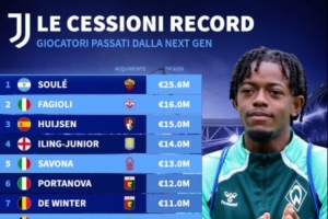 24直播網09月12日訊 尤文青訓球員轉會費榜單出爐,蘇萊以2560萬歐加盟羅馬居首,法喬利、赫伊森分列二三位。前十名球員分別以千萬歐級別轉會費加盟意甲、英超及德甲等球隊,凸顯尤文青訓的強大造血能力。