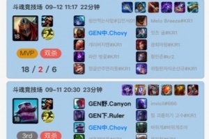 體育資訊9月12日訊 根據韓服排位統計小程序顯示,Chovy中午登上韓服打了一把斗魂競技砍下MVP后美美下線。