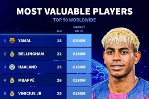 足壇身價(jià)最新排名:亞馬爾以2億歐元高居榜首,貝林厄姆、哈蘭德、姆巴佩同列1.8億歐元