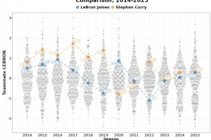 24直播網09月12日訊 數據媒體BBall-Index通過LEBRON值比較了詹姆斯與庫里隊友強度。結果顯示,在2014至2025年間,庫里隊友更強的年份多達10個,而詹姆斯隊友僅在2020和2021年占優。這凸顯了庫里長時期擁有更出色的團隊支持。
