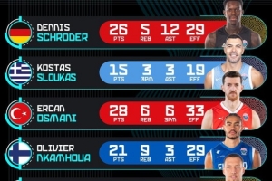 24直播網09月13日訊 9月13日,2025男籃歐錦賽半決賽結束。歐錦賽官推曬出球員高光數據:施羅德26分12助,奧斯馬尼砍下28分6記三分,卡姆霍亞21分9籃板,泰斯10分11籃板,斯洛卡斯貢獻15分3記三分。官推提問:半決賽上誰打得最好?