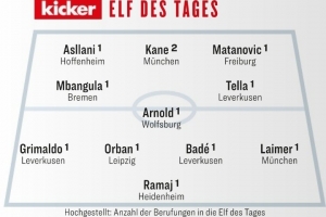 24直播網09月15日訊 《踢球者》公布了德甲第3輪最佳陣。門將為海登海姆的拉馬伊。后衛線由勒沃庫森的格里馬爾多、巴代,萊比錫的奧爾班及拜仁的萊默爾組成。中場包括不萊姆的姆班古拉、沃爾夫斯堡的阿諾德和勒沃庫森的泰拉。前鋒線上,霍芬海姆的阿斯拉尼、拜仁的凱恩和弗賴堡的馬塔諾維奇入選。