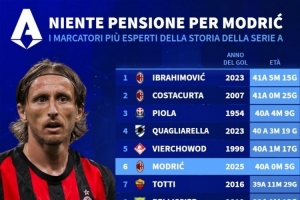 24直播網09月15日訊 意甲第3輪,莫德里奇40歲高齡破門助米蘭取勝。德國轉會市場隨之列出意甲年齡最大進球者排名,41歲的伊布高居榜首,40歲的莫德里奇位列第六,展現了老將的非凡價值。