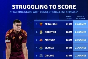 德轉統計進攻球員進球荒:埃文-弗格森25場,羅德里戈24場