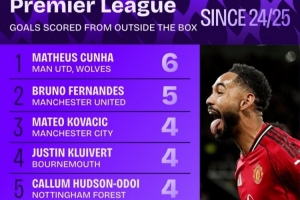 英超禁區外進球統計(上賽季至今):庫尼亞頭名領跑,B費次席,帕爾默上榜。